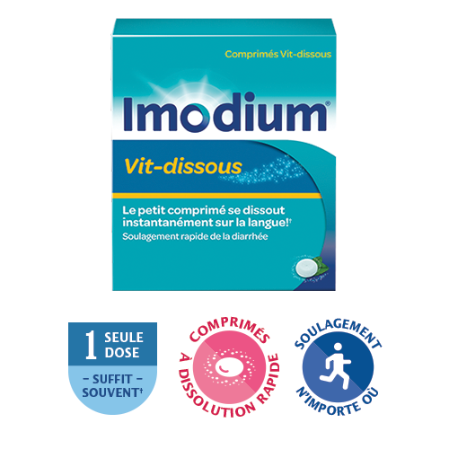 Les comprimés IMODIUM® Vit-dissous se dissolvent instantanément sur la langue, pour un soulagement rapide et efficace de la diarrhée.
